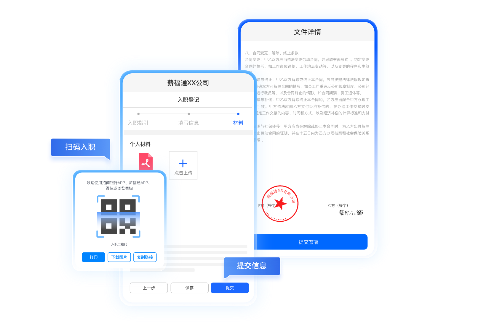 扫码入职在线填写,省去繁琐的纸质表格填写、录入、核对工作,入职同时可在线签署电子合同和提交工资卡开户申请,用工高峰期也能保持高效率