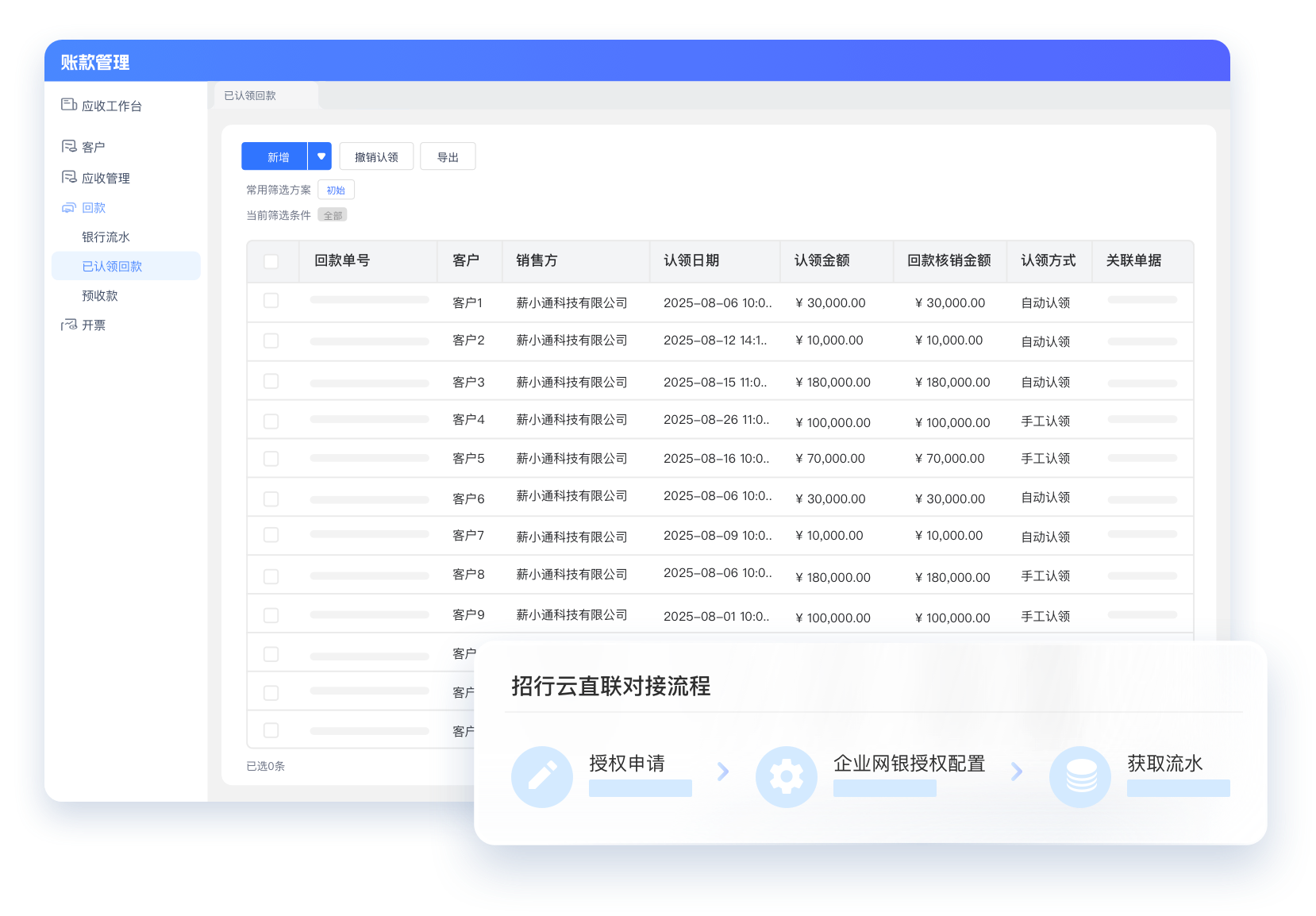 提供专属收款账号服务,可为业务员分配专属账号,回款直接进对公结算户,系统自动识别款项归属,资金安全有保障