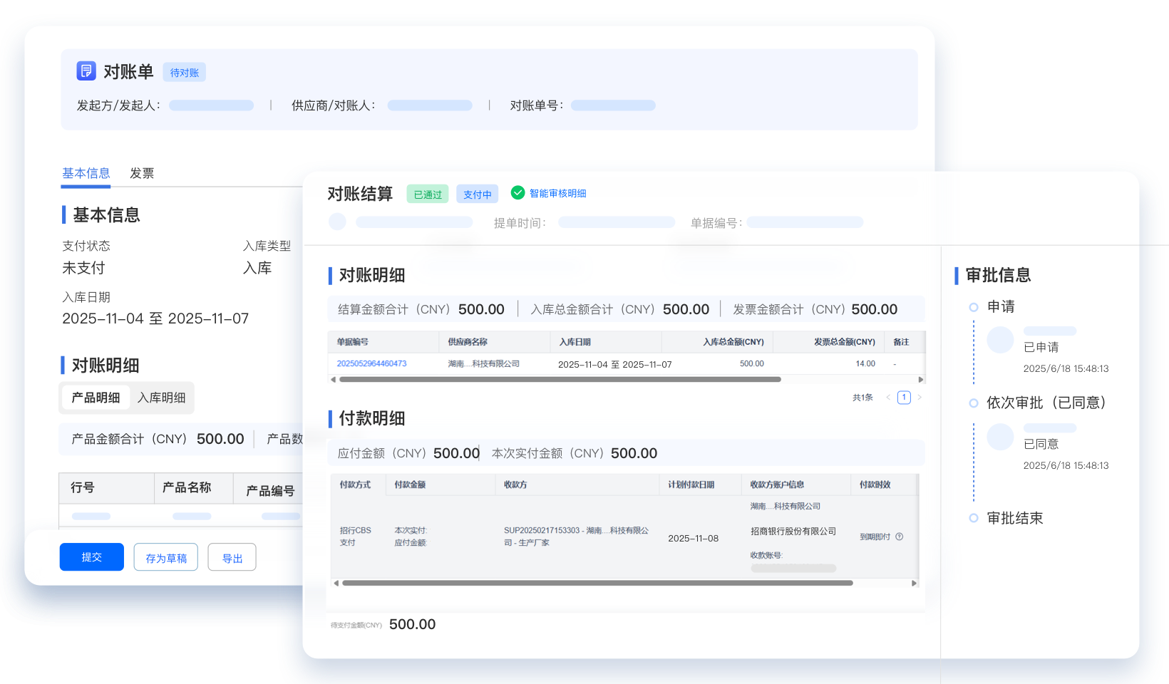 客户对账单等快速按供应商拆分,并同步供应商确认,确保信息准确,数据留痕,按期完成结算