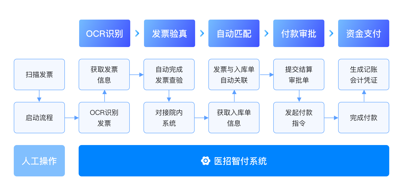 打通药品耗材库存管理系统(HIS、SPD)及财务系统,医院线上完成发票查验,发票匹配,单据提交、审批及支付,线上管理付款账期,凭证由系统自动生成,实现“货、票、账、款”一致性管理